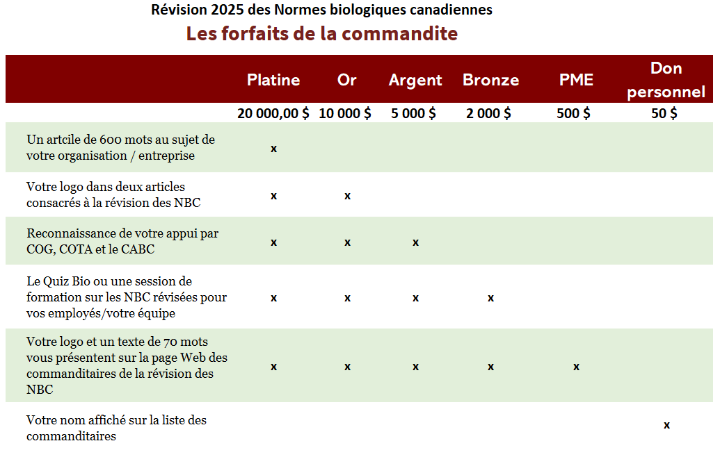 Votre logo et une description de 70 mots décrivant votre entreprise seront publiés sur la page des commanditaires de la révision des NBC! Nous créons un lien direct avec la communauté biologique, en affichant qui vous êtes, ce que vous faites et pourquoi le secteur biologique est important pour vous.